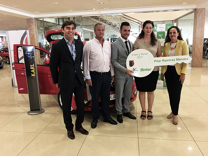 En el acto de entrega estuvieron presentes Miguel A. Surez, director comercial de Binter, y Ramn Valiente, director comercial del grupo Cabrera Medina. Pilar Ramrez Mndez fue la afortunada ganadora del vehculo. La compaa area tambin estuvo representada por Vctor Hernndez, responsable de Productos y Servicios, y Marta Ojeda, jefa de Marketing.